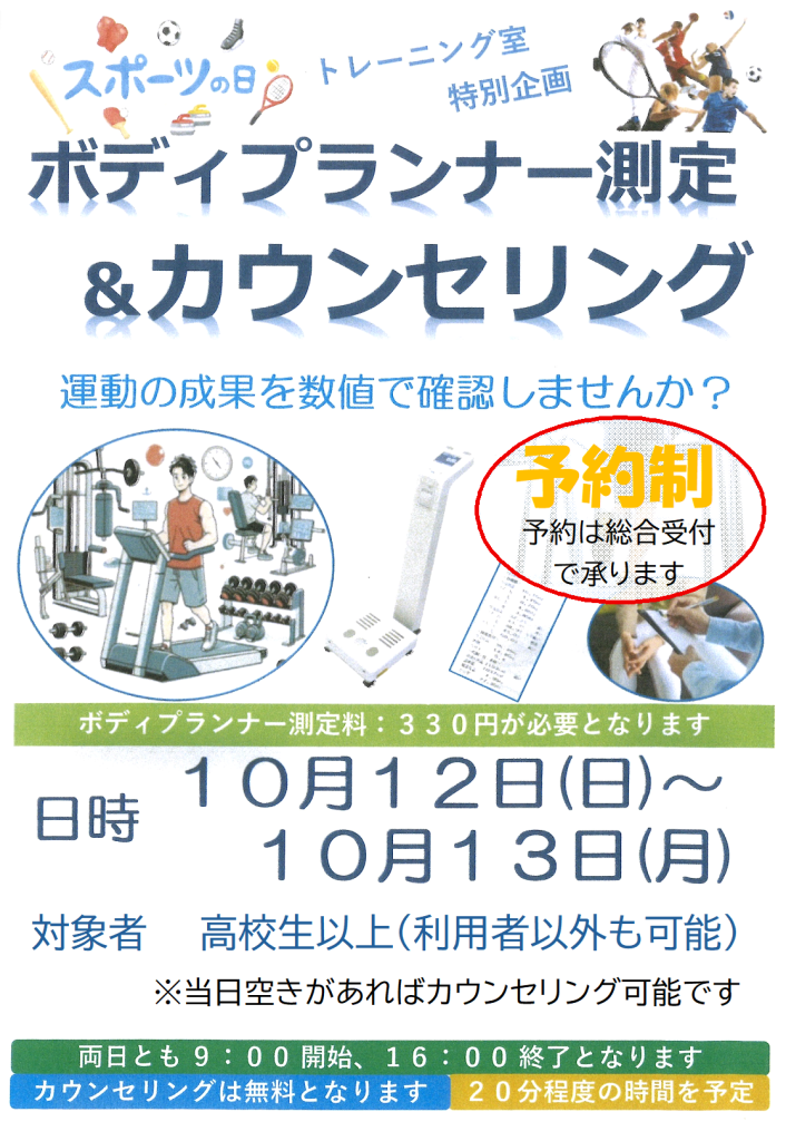 〈スポーツの日イベント!〉ボディプランナー測定(体組成測定)&カウンセリング